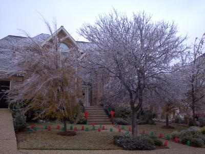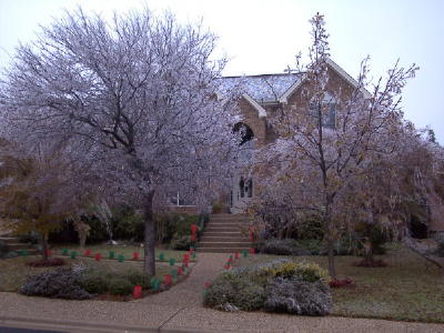 Old Man Winter's visits to our area are few and far between. Usually we get a freeze around Thanksgiving or Christmas and then maybe a few more cold days throughout the winter. Ice or snow are rare. Our first ice storm in several years hit last night. We were sent home early from work and haven't gone in yet today (Dec. 13). Caught these pictures of our iced trees. The ice felled one tree and beat down a couple of bushes.